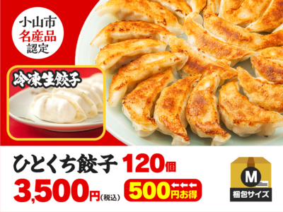 ひとくち餃子 120個(24人前)。焼目パリッ!ひだモッチリ!の食感がたまらず、餃子の餡を使い美味しさそのままに王道真っ直ぐ引き算の美学!