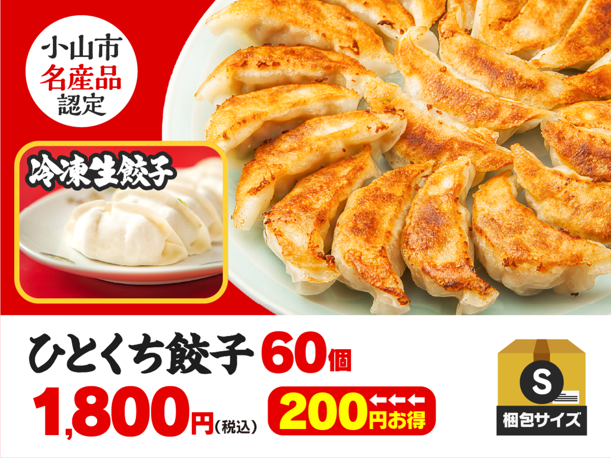 ひとくち餃子 60個(12人前)。焼目パリッ!ひだモッチリ!の食感がたまらず、餃子の餡を使い美味しさそのままに王道真っ直ぐ引き算の美学!